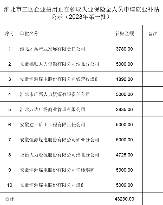 关于淮北市直、三区企业招用正在领取失业保险金人员申请就业补贴的公示名单(2023年第一批)