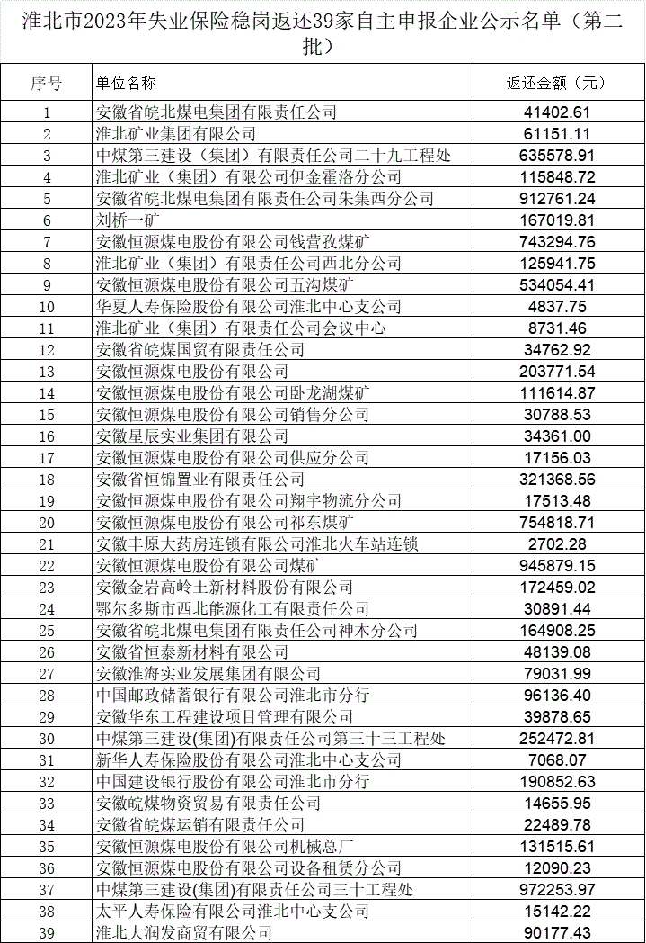 淮北市2023年失业保险稳岗返还39家自主申报企业公示(第二批)