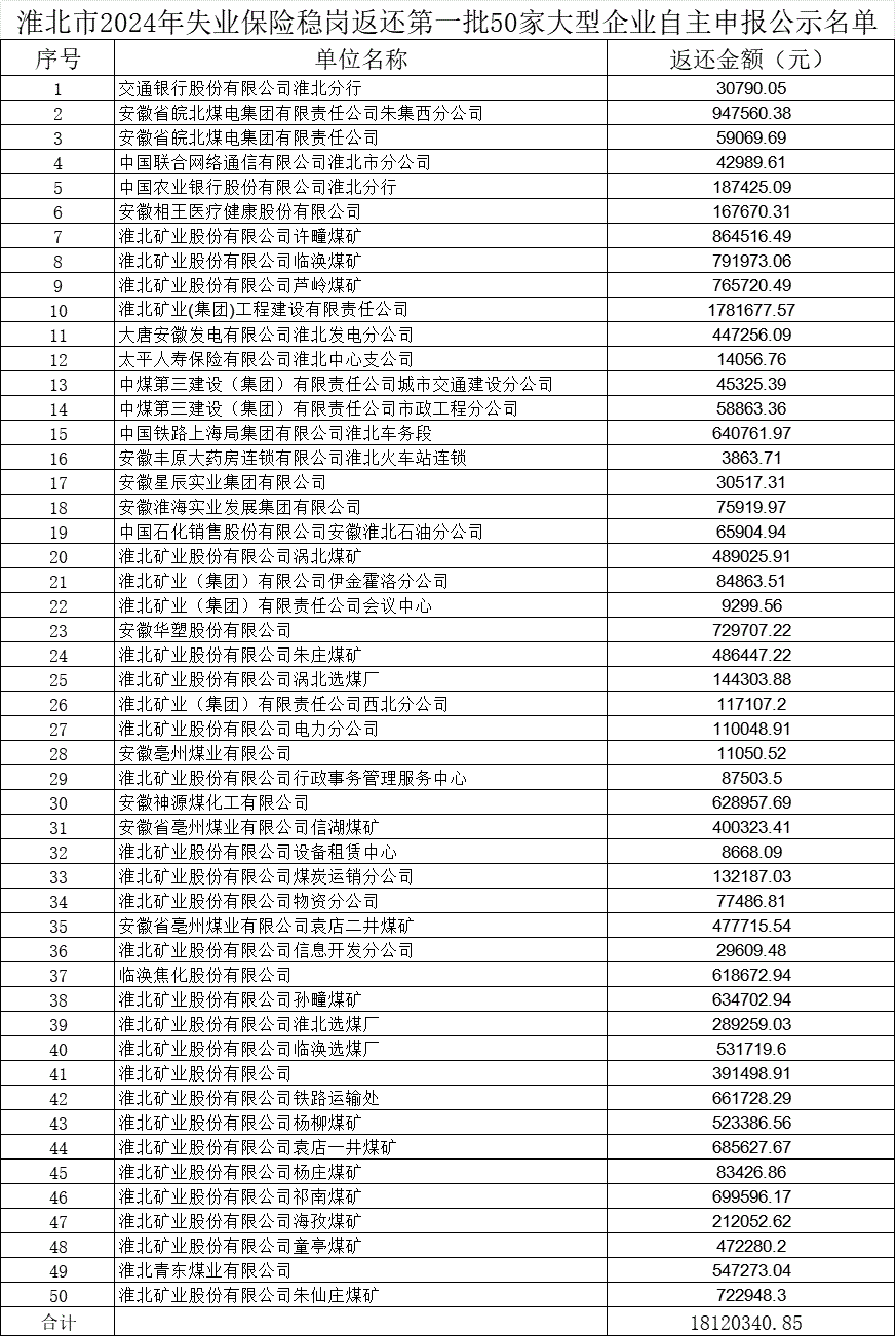 淮北市2024年失业保险稳岗返还第一批50家大型企业自主申报公示