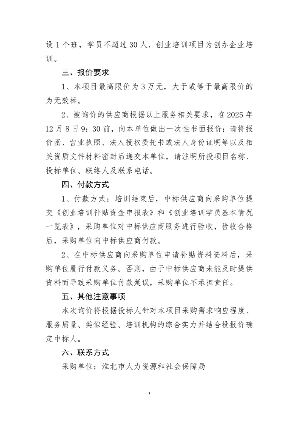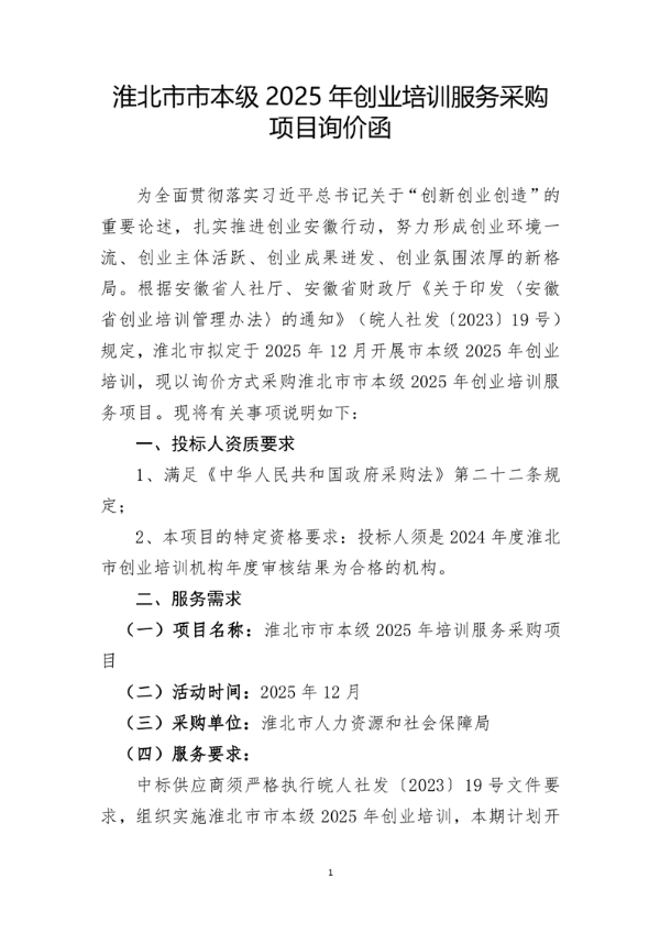 淮北市市本级2025年创业培训服务采购项目询价函