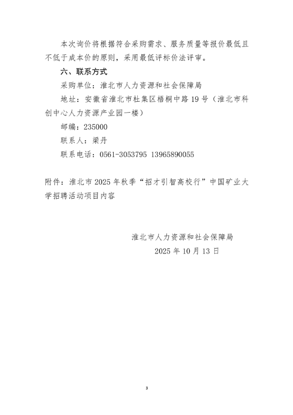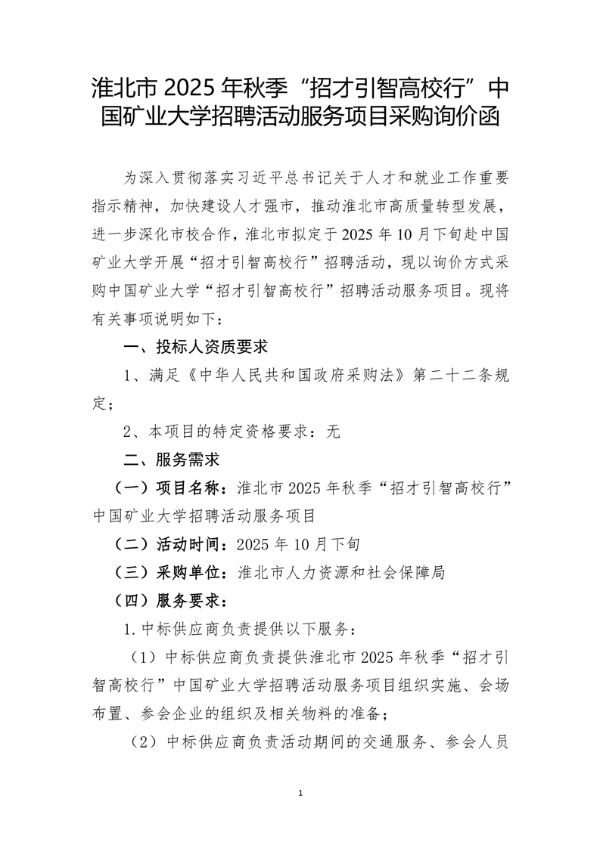 淮北市2025年秋季“招才引智高校行”中国矿业大学招聘活动服务项目采购询价函