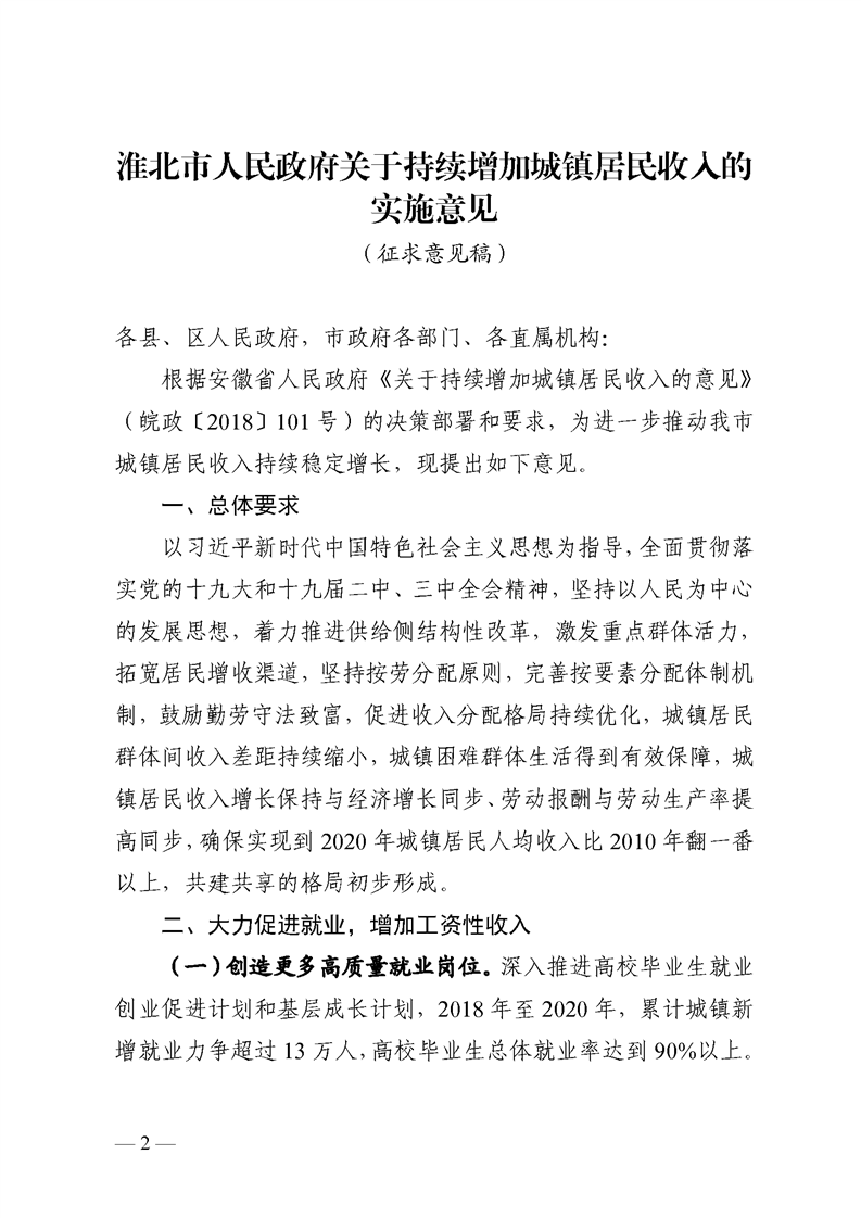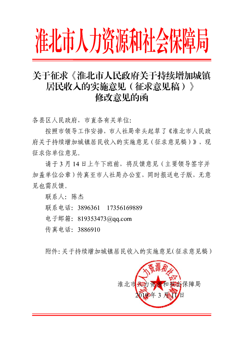 【部门征集】关于征求《淮北市人民政府关于持续增加城镇居民收入的实施意见(征求意见稿)》修改意见的函
